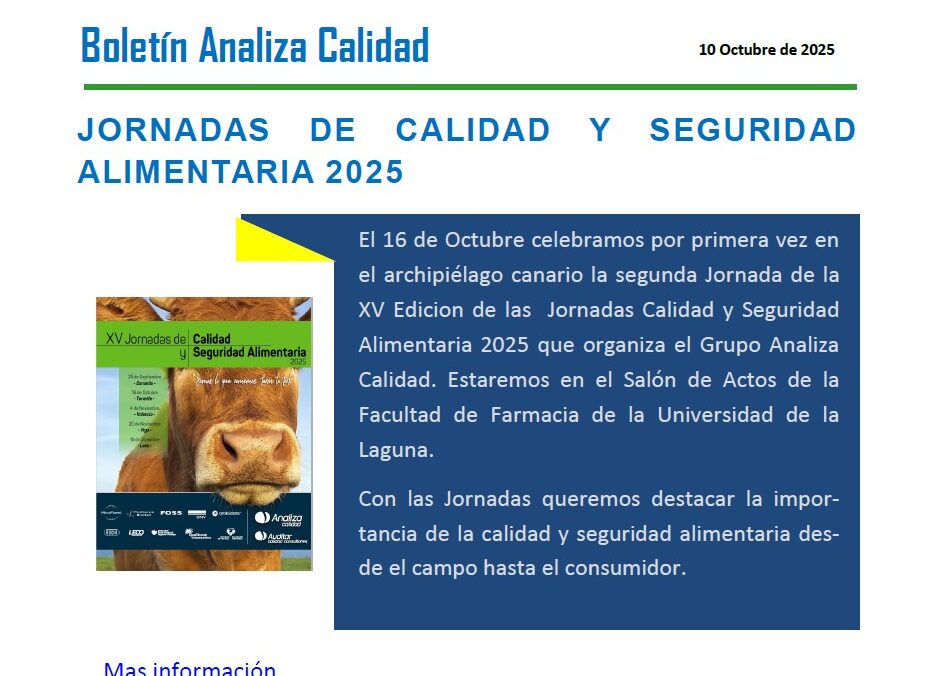 JORNADAS DE CALIDAD Y SEGURIDAD ALIMENTARIA 2025 Contaminación química mundial: los PFAS se acumulan cada vez más en el medio ambiente El huevo resalta sus propiedades como alimento «único» en la era digital Errores comunes en la validación y verificación del APPCC en la restauración colectiva Boletin ANALIZA 10 Octubre